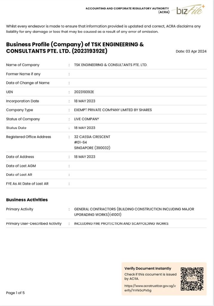 At TSK Engineering & Consultants Pte Ltd, we take quality, safety, and compliance seriously. Our certifications validate our expertise, professionalism, and commitment to delivering the highest standards in engineering, maintenance, and repair services.